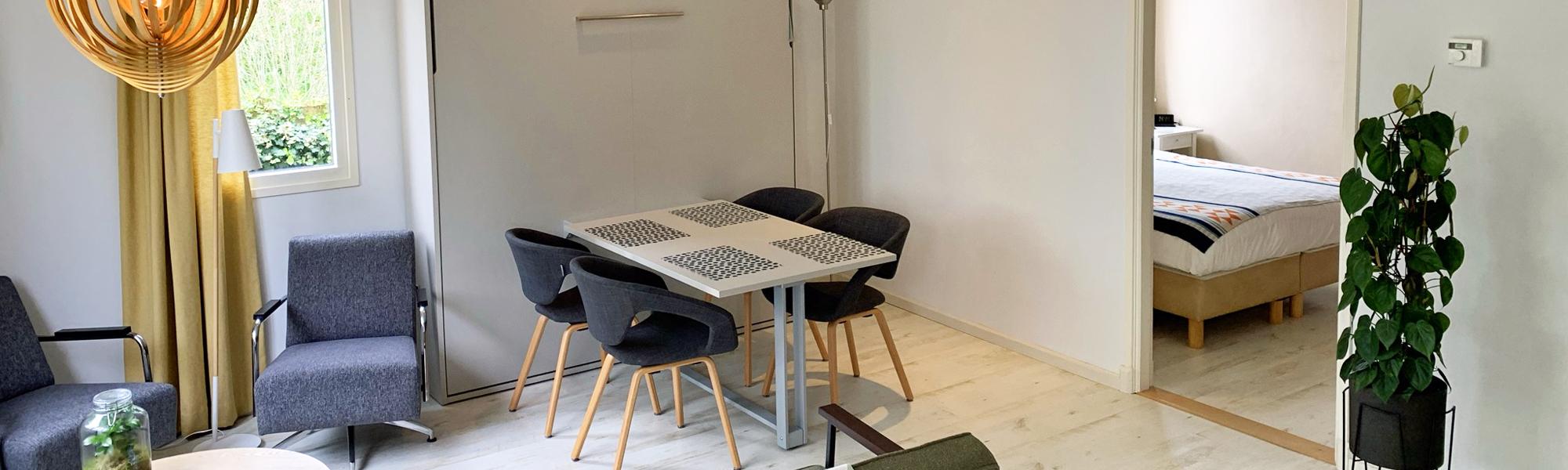Holiday apartment Noordpolderzijl is a pleasant and spacious holiday home. A cozy apartment for families with children or if you are looking for a little more space for the two of you. The bedroom has two single hotel box-spring beds with anti-allergenic duvets. There is a spacious bathroom with shower, toilet and sink. In the living room you will find the dining area and the sitting area with a double sofa and flat screen TV. On the wall is the wall bed containing a 180 cm wide, already made double bed, which you can fold down in no time at all, whereby the table folds under the bed. The open kitchen is fully equipped with a hob, oven, refrigerator, microwave and dishwasher. The private terrace with garden faces south and borders the pond.